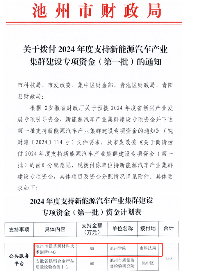 近日,根据池州市财政局下发了《关于拨付2024年度支持新能源汽车产业集群建设专项资金(第一批)的通知》,由js3845金沙线路与池州市政府、重庆大学合作共建的“池州市镁基新材料技术创新中心”获批2024年度支持新能源汽车产业集群建设专项资金(第一批),拨付金额为50万元。