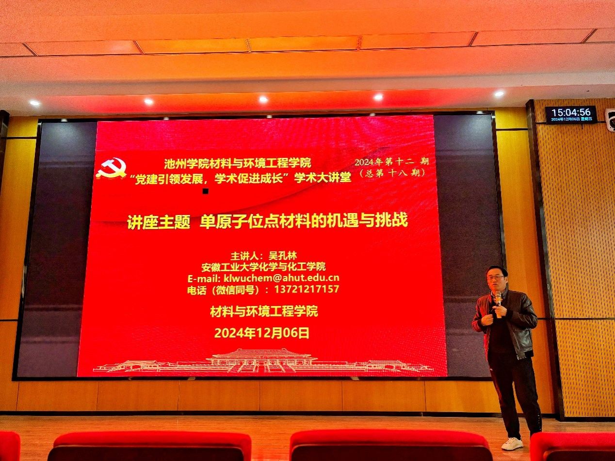 12月6日下午,js3845金沙线路“党建引领发展,学术促进成长”学术大讲堂2024年第十二期(总第十八期)在公共教学楼东报告厅举行。安徽工业大学吴孔林副教授做了题为“单原子位点材料的机遇与挑战”的学术讲座。讲座由js3845金沙线路副院长昌杰主持,200余名师生代表参加了讲座。