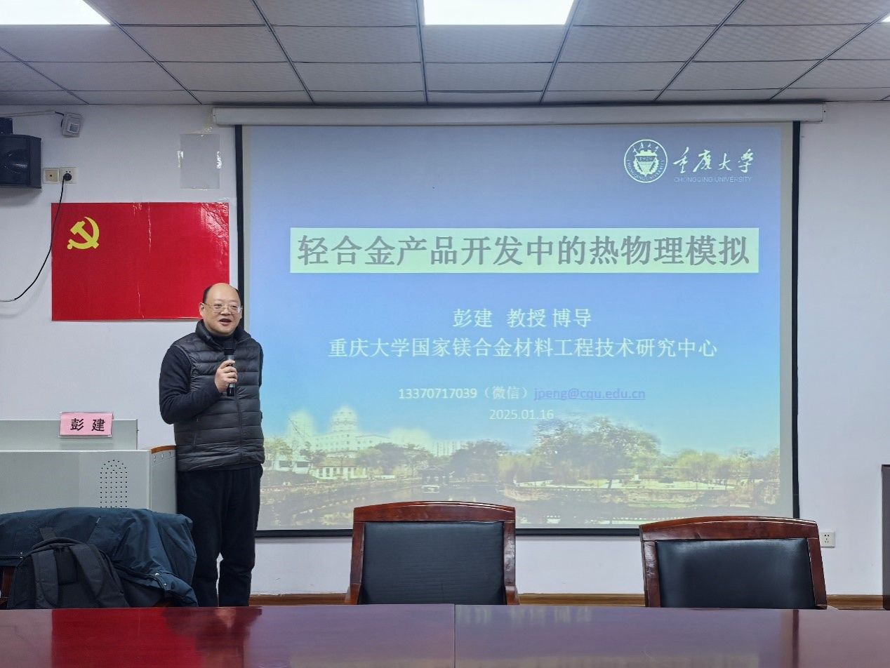 重庆大学教授、国家镁合金中心副总工程师彭建教授的学术报告题目为《轻合金产品开发中的热物理模拟》,彭建教授介绍了热物理模拟技术及其在从轻合金新材料研究到产品开发过程的应用案例,介绍其对减少研发试错,提高研发效率的重要性,以及近期重点关注的热物理模拟技术用于轻合金产品发展方向。