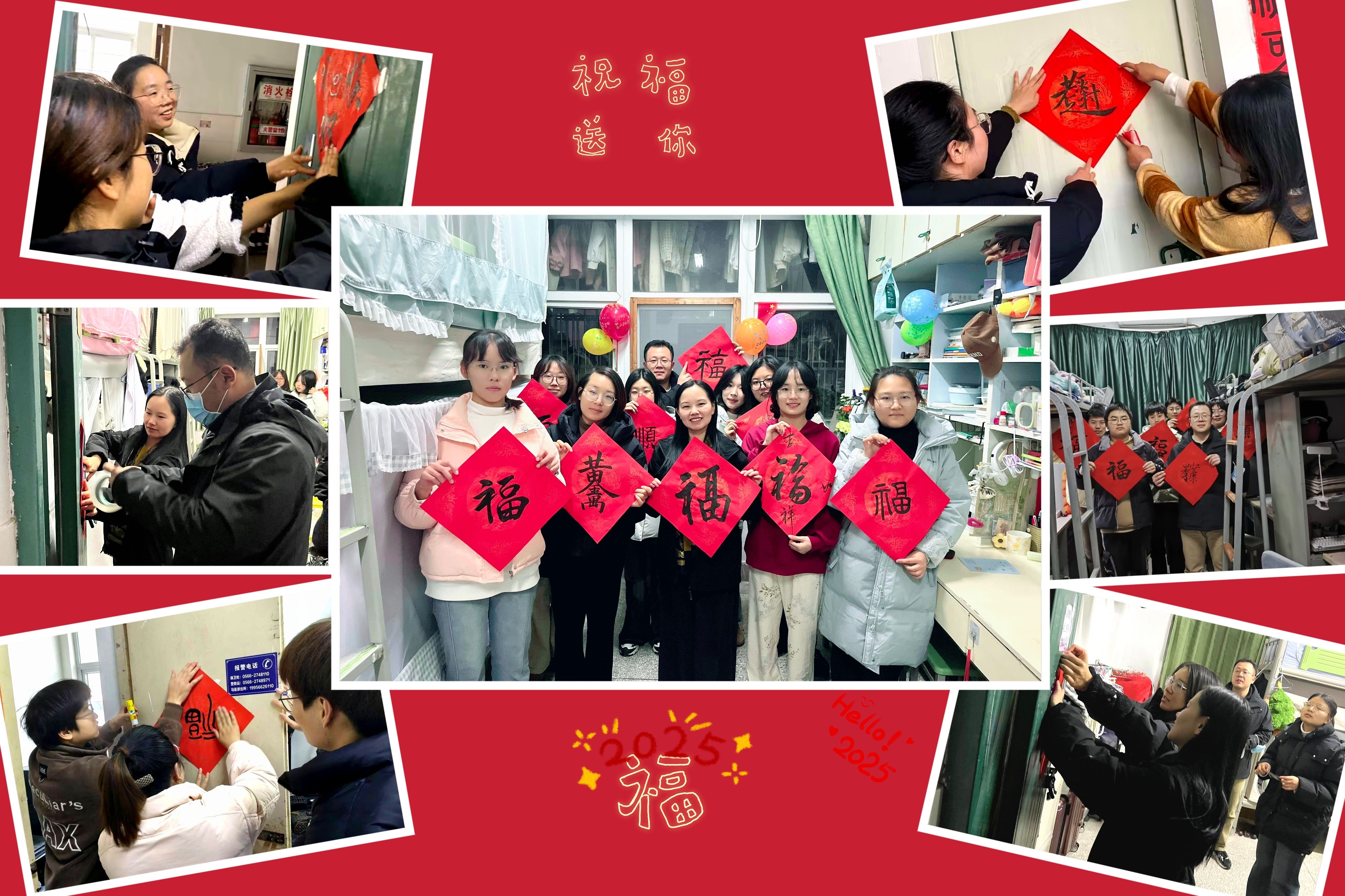 刘昉带领辅导员们在一个个学生宿舍门上,张贴着一张张学院志愿者们爱心书写的“福”字,并亲切与学生们交流,详细询问同学们的学习和生活情况,以及遇到的困难和需求;鼓励同学们在新的一年里,与书相伴、与勤相随,不断汲取智慧和力量。同时,刘昉一行还仔细查看了学生的住宿条件,对寝室的安全和卫生等方面进行了检查,叮嘱学生要保持良好的生活习惯,合理安排作息时间,认真复习,以良好的心态迎接期末考试。