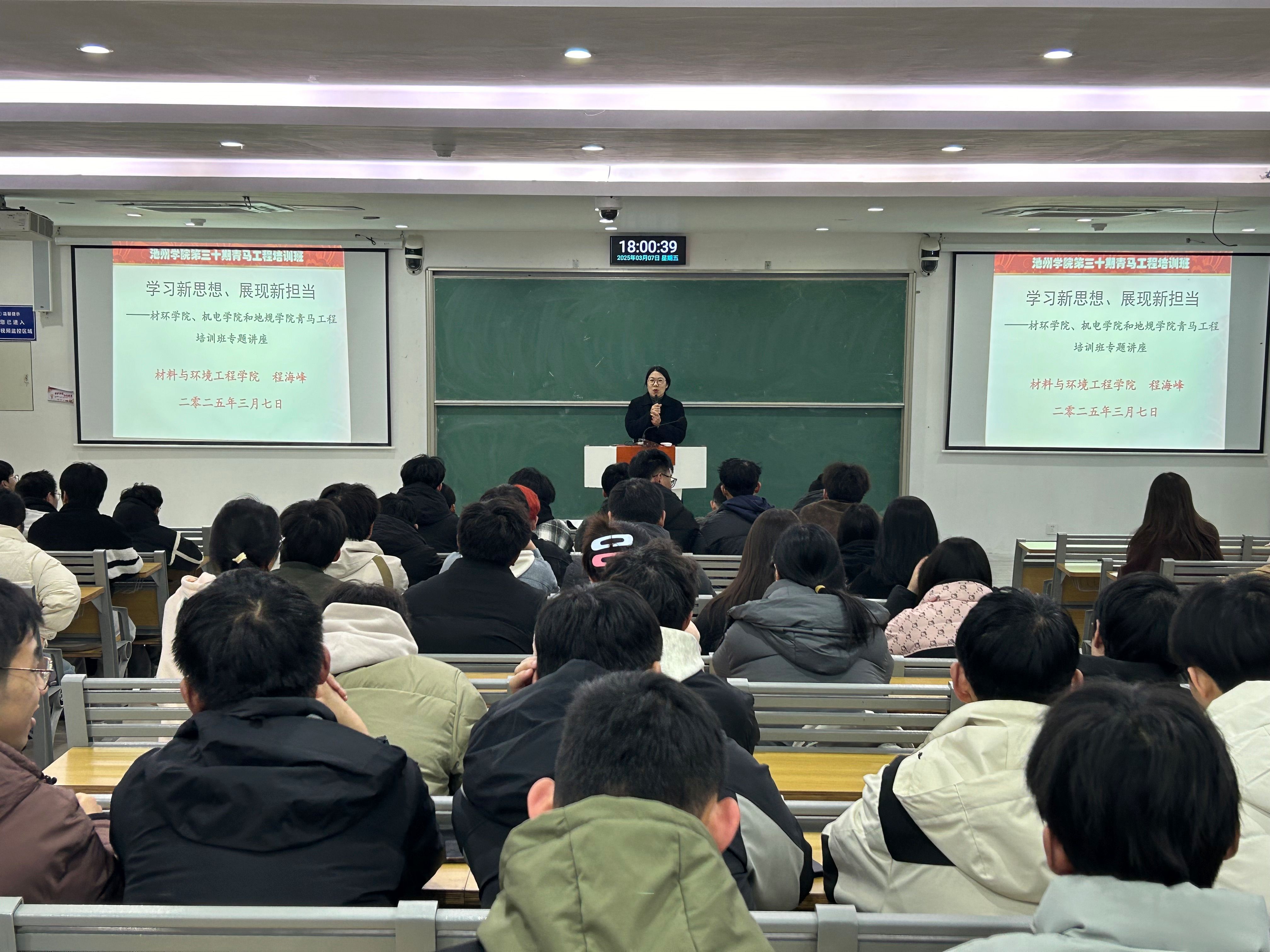 3月7日晚,js3845金沙线路联合机电工程学院、地理与规划学院共同组织的第三十期“青马班”第一课在公共教学楼北阶101教室举办。此次课程由材环学院党委书记程海峰主讲,青马班全体成员参加此次学习。