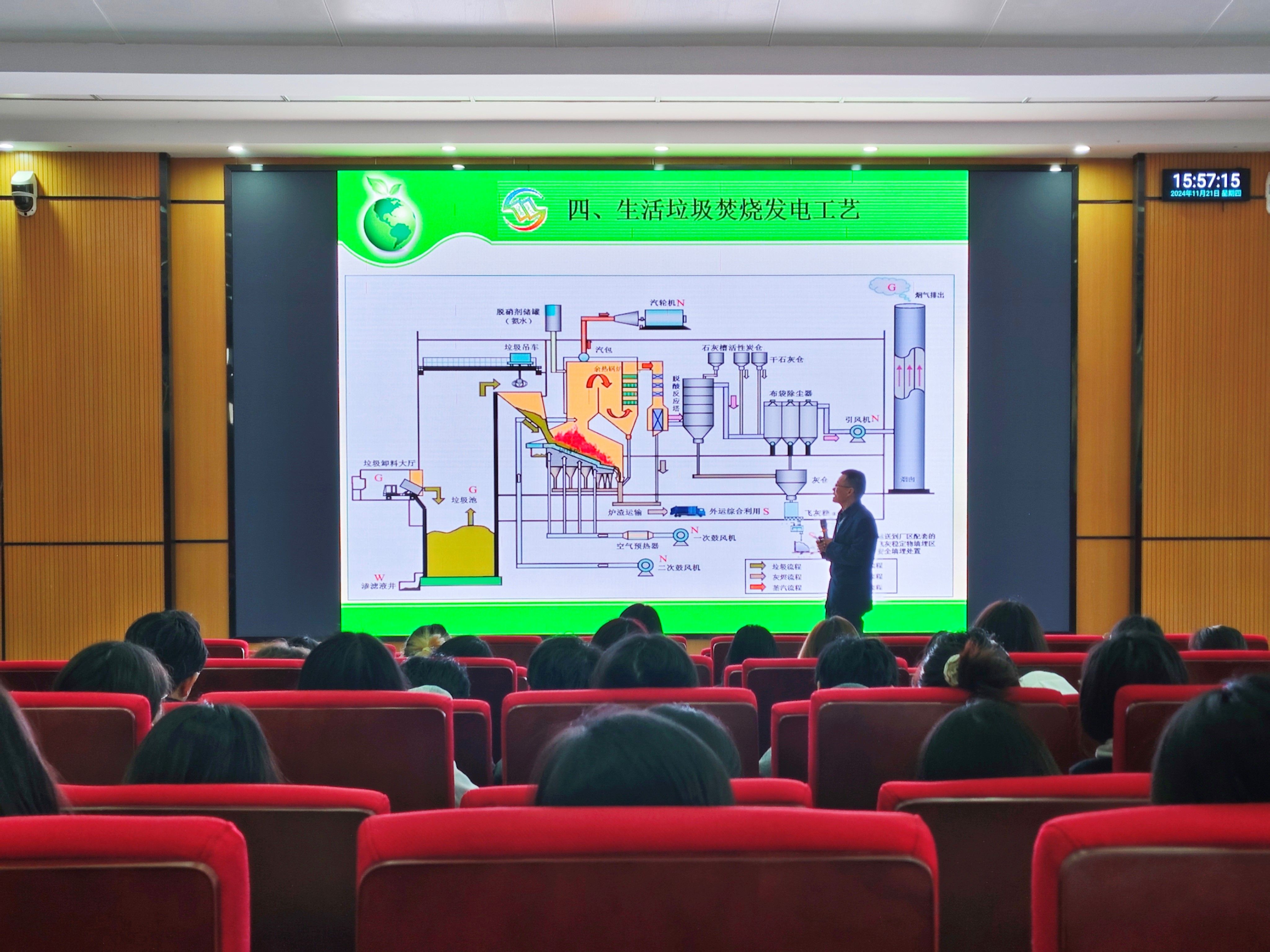 同期,杨国璋副总经理走进《固体废物处理与处置》课堂,为同学们讲授《生活垃圾焚烧发电工艺》。杨总凭借皖能集团在生活垃圾焚烧项目中的丰富经验,详细介绍了生活垃圾焚烧发电的工艺流程,特别针对渗滤液、臭气、焚烧烟气及飞灰等关键处理环节进行了深入剖析。此外,杨总还分享了自己的职业成长经历,激励学生扎实掌握专业知识,培养辩证思维能力,积极积累实践经验。