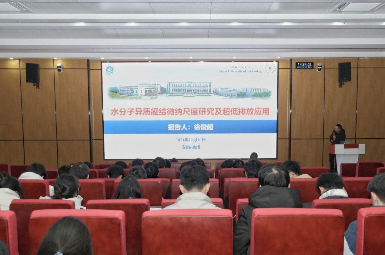 12月10日下午,js3845金沙线路“党建引领发展,学术促进成长”学术大讲堂2024年第十四期(总第二十期)在js3845金沙线路公共教学楼东报告厅举行。安徽工业大学能源与动力工程专业系主任徐俊超副教授作了题为“水分子异质凝结微纳尺度研究及超低排放应用”的学术报告。报告由环境工程教研室于磊博士主持,100余名师生代表参加了报告。