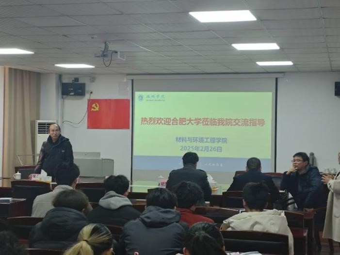 2月26日下午,合肥大学材料学院黄俊俊教授、胡恩柱教授、生物食品与环境工程学院叶劲松高级实验师、卫新来副教授和张金流副教授一行来金沙线路官网开展研究生招生宣传及工作交流。环境工程教研室主任傅妍芳、相关老师及学生代表参加交流。