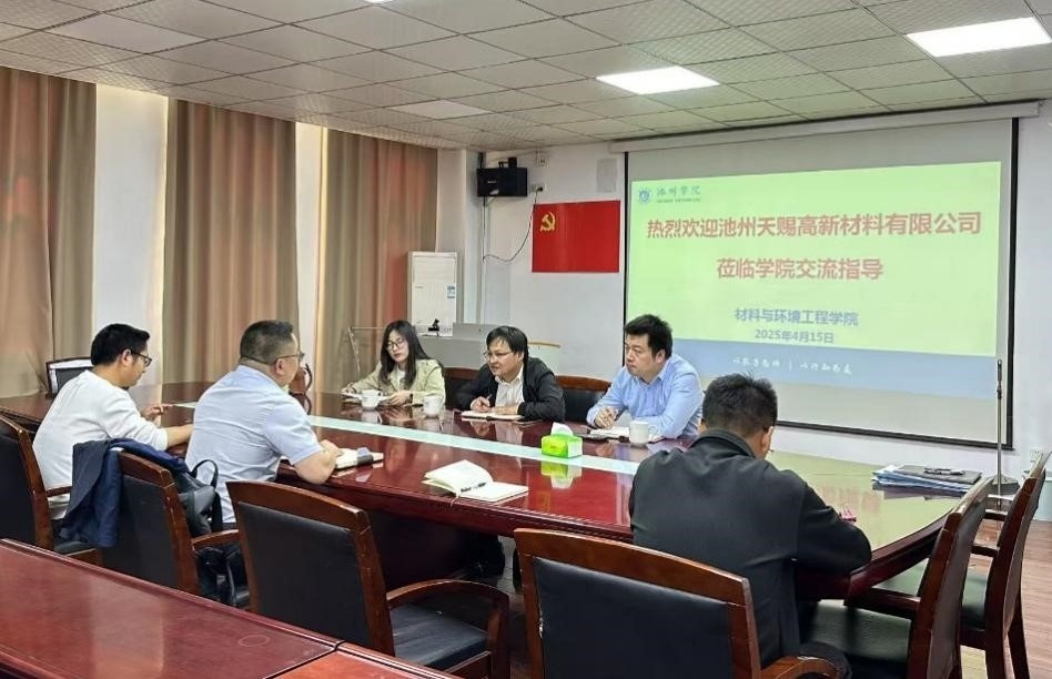 会上,肖新乐对池州天赐高新材料有限公司的到来表示热烈的欢迎,并介绍了学院的基本情况。池州天赐高新材料有限公司研发经理郭冬冬、技术经理晏军和总经办主任张学芳就脱酸树脂产品的开发方向及科研团队建设等内容与学院进行了深入沟通,并初步达成了合作意向。最后,双方就后续的合作机制、研发项目以及人才联合培养模式交换了意见。