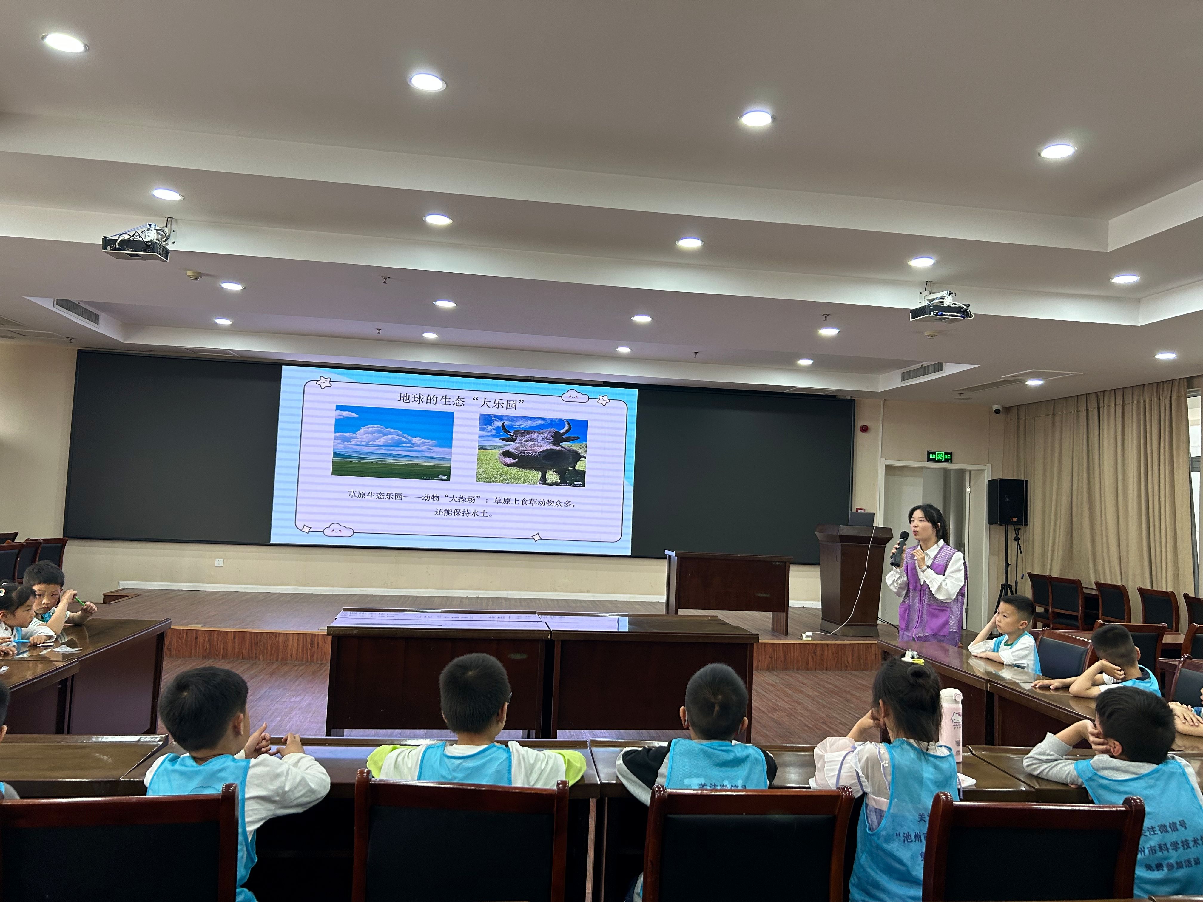 在池州市科技馆,学院志愿者化身“地球知识探索引路人”,通过PPT图文并茂地讲解地球结构、生态系统,以及全球变暖、土地荒漠化、海洋酸化、生物多样性丧失等现状。生动的内容激发了同学们的参与热情,大家积极互动、踊跃提问。志愿者还引导大家思考“如何让家园更健康、让地球更开心”,呼吁同学们爱护地球、守护生态,让环保理念从抽象概念转化为可感知的生活实践。
