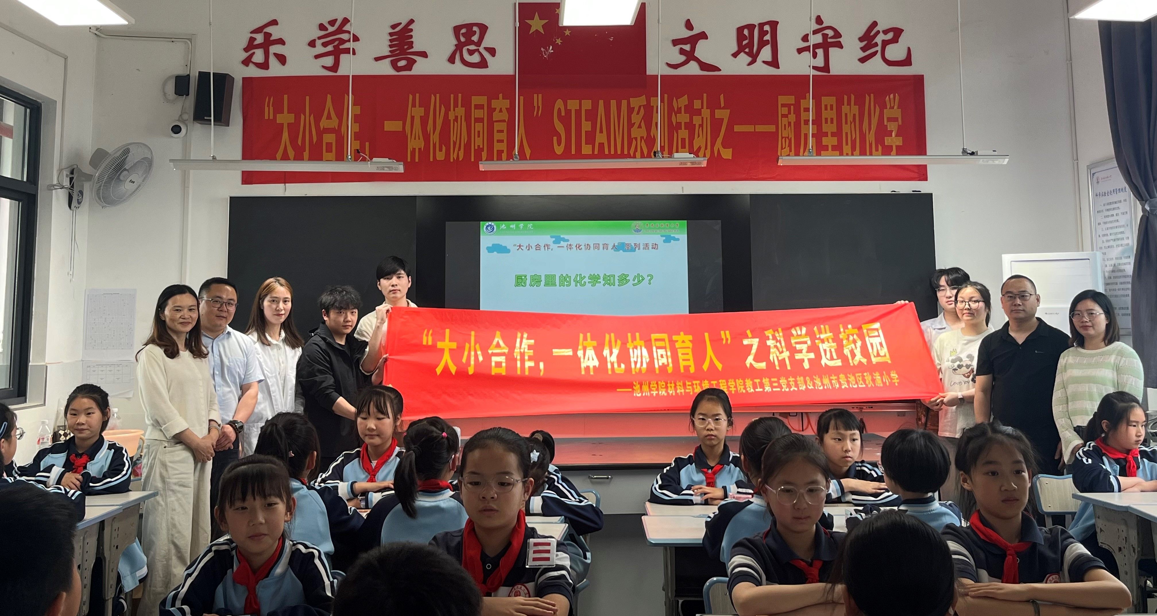 4月27日下午,js3845金沙线路教工第三党支部赴池州市贵池区秋浦小学开展“大小合作,一体化协同育人”系列活动之“厨房中的化学”。活动由秋浦小学科学老师樊霞主持,js3845金沙线路副院长昌杰、肖新乐、学生第二党支部党员师生代表,以及秋浦小学四年级师生代表参加了活动。